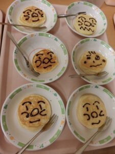 利用者様はホットケーキ、子供達は持参したおやつを一緒に食べました。子供達は、利用者様が作ってくれた兜とこいのぼりをお土産に貰いました。
