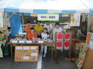 話は変わりまして、タイトルでもあるように9月2日各務原市民会館にて各務原福祉フェスティバルに参加させて頂きました!今年の福祉フェスティバルでは74団体参加しその中の1つ私達は、去年まで誠道会としてブースを出していましたが、今年は誠道会・成光会協同でブースを出店しました。誠道会からは各務原リハビリテーション病院のリハビリ職員、デイケア菜の花、デイサービス菜の花の介護職員、成光会からは特養菜の花のリハビリ職員(私です)がスタッフとして参加しました。