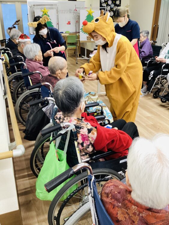当日は、スタッフ一同気合を入れて準備! サンタクロースやトナカイの衣装に身を包み、皆様をお出迎えしました。「あら、可愛いわね!」「似合ってるよ!」と利用者様からも笑顔がこぼれ、いつもとは違う賑やかな雰囲気に包まれました。