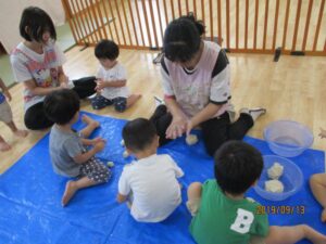 午前中は、子ども達と小麦粉粘土でお月見団子を作り、