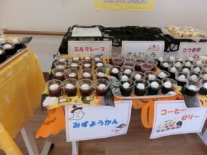 今回のおやつレクリエーションでは、手作りの南瓜プリン・コーヒーゼリー・水ようかん・さつま芋蒸しパンなど旬の食材を使用したおやつ計6種類から気に入った2つのおやつを選んでいただきました。