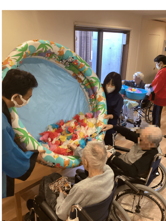 レクリエーションでは、玉入れ、金魚すくいをおこないました。短時間ではありましたが、みなさん楽しんでいただけました。