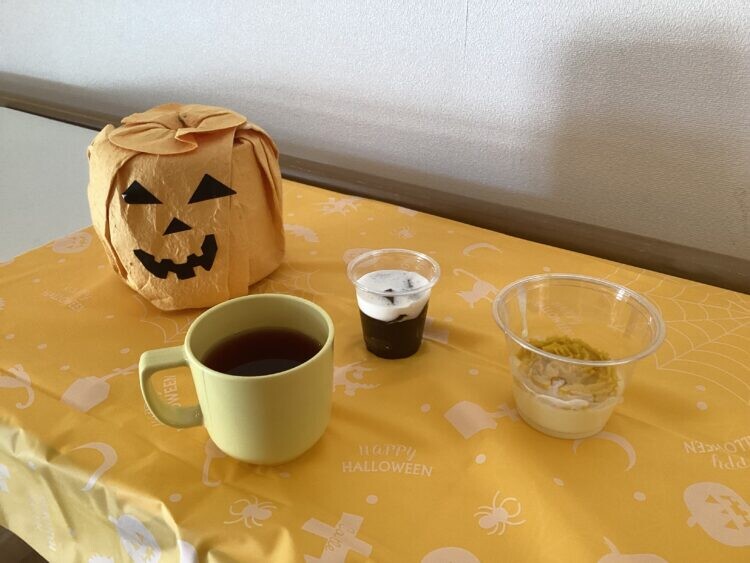レクリエーション後のおやつでは、厨房、栄養師手作りのカボチャプリン、コーヒーゼリーを提供させていただきました。みなさん普段の倍のおやつをペロリと食べられました。