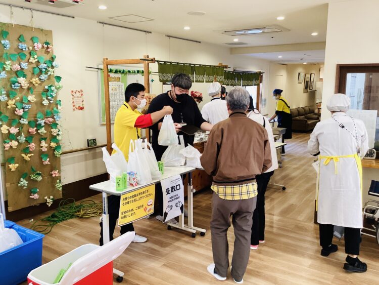 出店では焼きそば、フランクフルト、ポテトといった定番の美味しい屋台グルメを無料でご提供させていただきました。利用者様もご家族様も、お飲み物と一緒に、お祭り気分を味わいながら召し上がっていらっしゃいました。