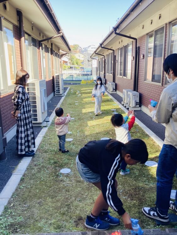 また、中庭にはシャボン玉コーナーを設置。キラキラと舞うシャボン玉に、小さなお子様から皆様が癒されている様子が印象的でした。